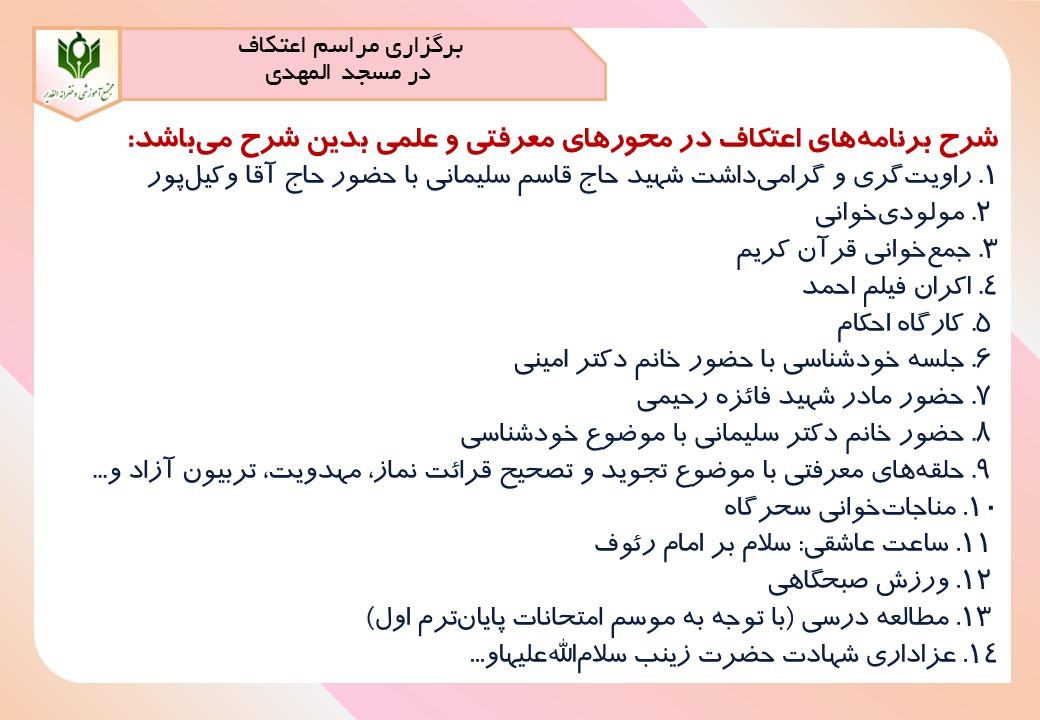 برگزاری مراسم اعتکاف در مسجد المهدی (13 الی 15 دی ماه)